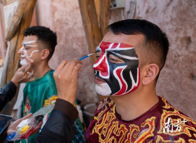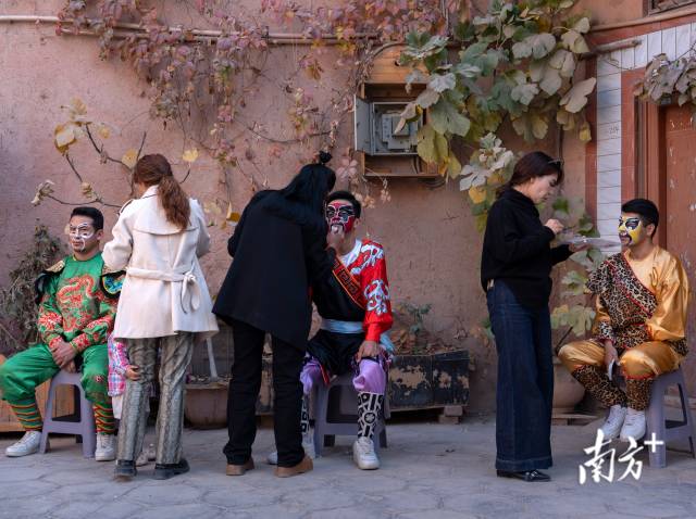 10月31日,演出前,喀什古城歌舞团女演员为古城英歌队队员化妆。一年前她们对英歌妆容还是比较陌生,经常会画错又耗时,经过一年多的锻炼,现在手法娴熟,每次都能精准地把握住英歌妆容的精髓。