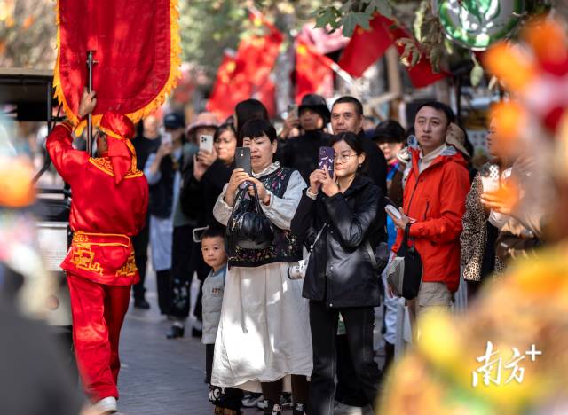 10月31日,“粤喀情”古城英歌舞队在演出,吸引沿街的商家和游客驻足欣赏。