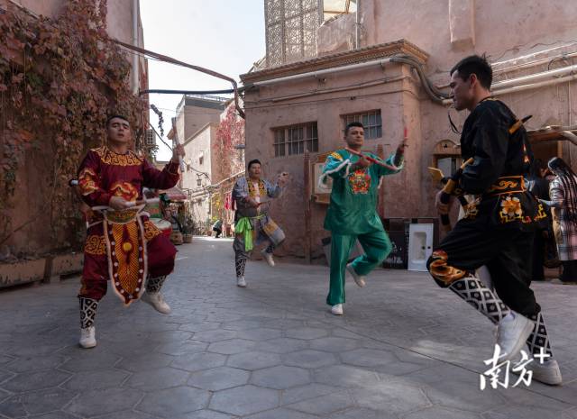10月31日下午,“粤喀情”古城英歌舞队在喀什古城东门广场上演出。