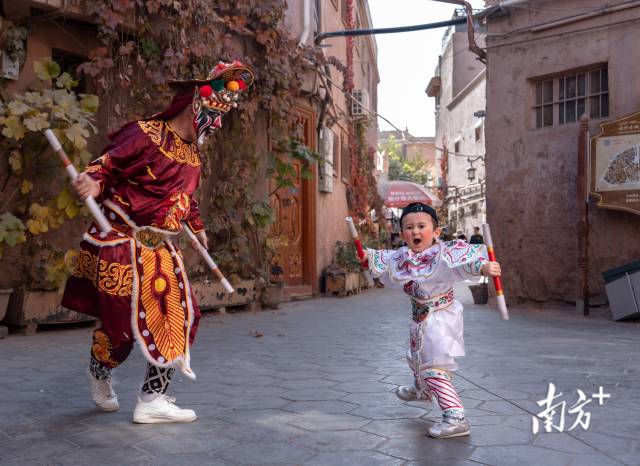 这是广东英歌的号子。“粤喀情”古城英歌舞队队长艾日夏提江·艾力循声望去,古城石板路间,自己2岁多的儿子艾福冉转起英歌槌,学着他的样子在表演。