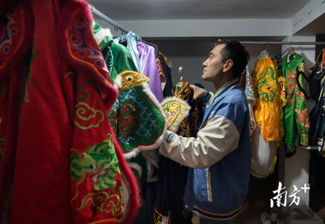 10月31日,在喀什古城景区演员服装间,队长艾日夏提江·艾力在整理英歌舞演出服装。