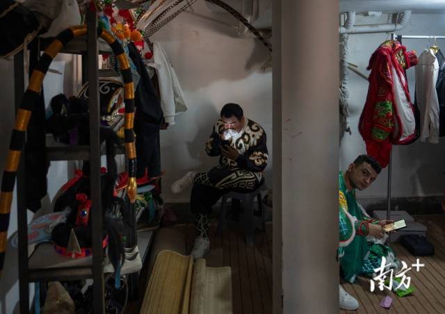 10月31日,“粤喀情”古城英歌舞队队员在化妆,为演出做准备。