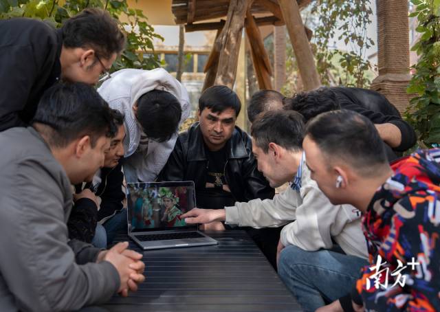 10月29日,在新疆喀什古城,“粤喀情”古城英歌舞队部分队员在工作间隙观看学习广东英歌舞的短视频。