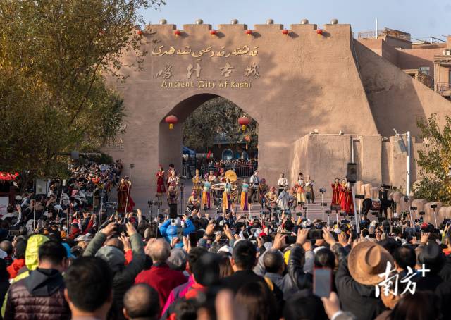 11月1日,“粤喀情”古城英歌舞队队员参与喀什古城开城门仪式表演,现场被游客围得水泄不通。