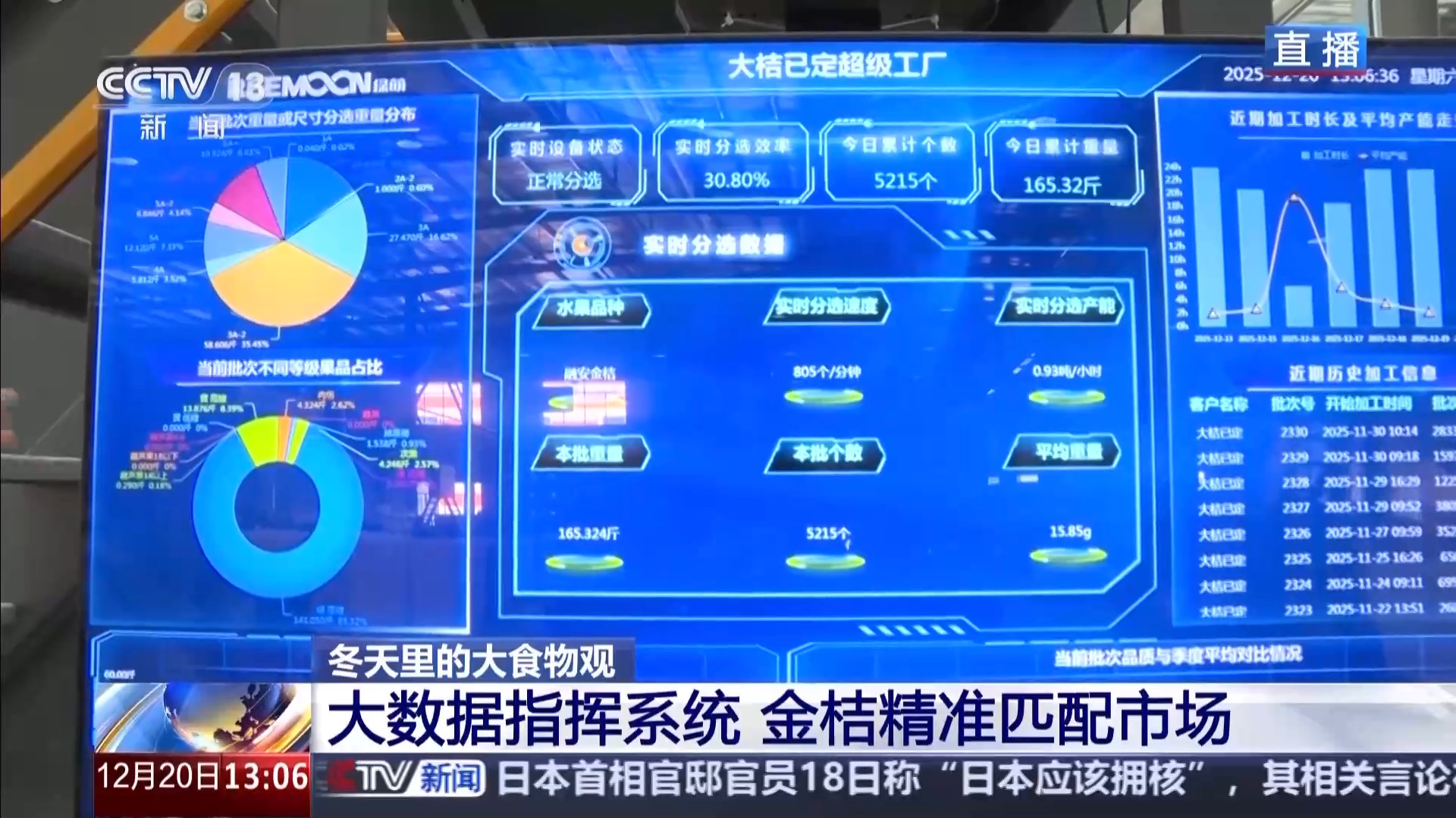 总台记者 孔祥新:我所在的位置是融安一家金橘数字化产地仓,身边这个设备就是一个可视化大数据指挥系统,屏幕可以实时显示后面正在分拣金橘的相关数据,包括果子的大小、糖度、色泽等。