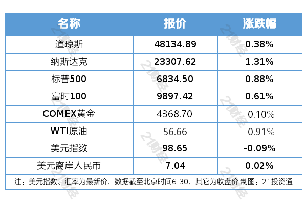 纽约股市三大股指12月19日上涨。截至12月19日收盘,道琼斯工业平均指数比前一交易日上涨183.04点,收于48134.89点,涨幅为0.38%;标准普尔500种股票指数上涨59.74点,收于6834.50点,涨幅为0.88%;纳斯达克综合指数上涨301.26点,收于23307.62点,涨幅为1.31%。
