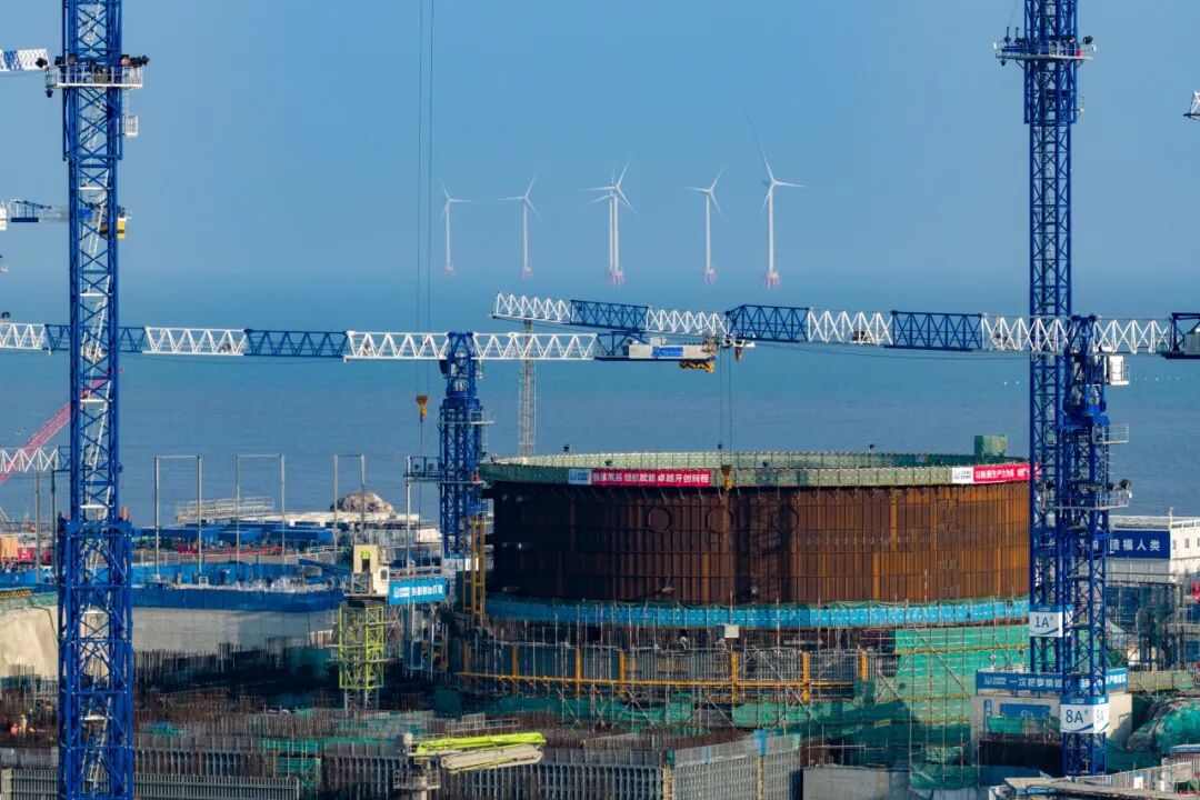 12月15日,浙江宁波象山县金七门核电项目建设现场,机械轰鸣,施工人员有序作业。章勇涛摄
