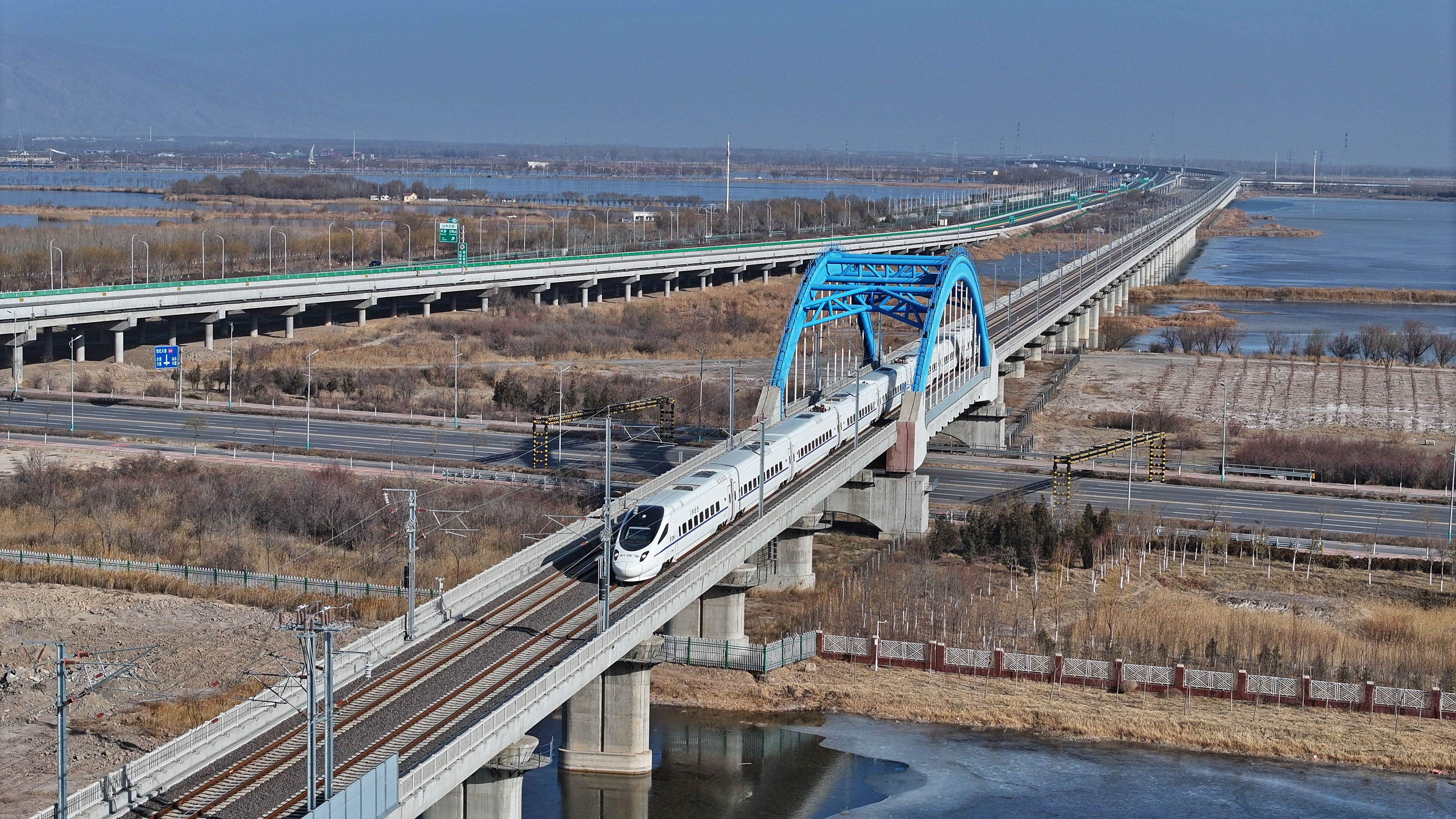 2025年12月23日,包银高铁首发列车D4667次动车组行驶在宁夏石嘴山境内(无人机照片)。新华社记者 王鹏 摄