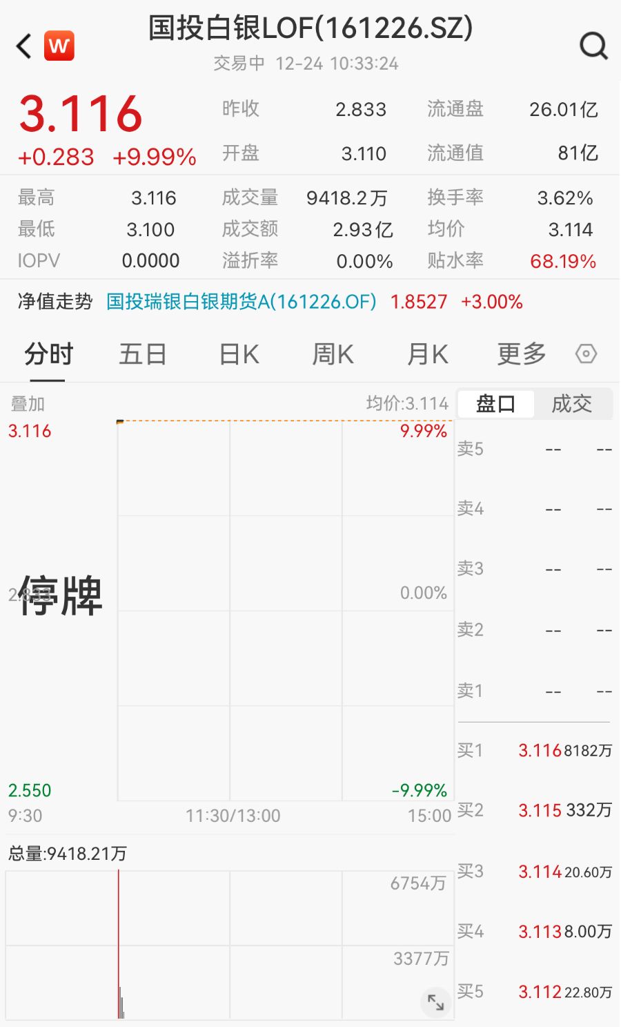 12月24日,国投白银LOF复牌后又涨停,场内溢价近70%。