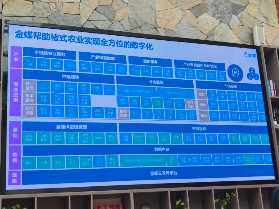 再是数字化从业者缺乏对农业的系统化了解。林法成坦言,金蝶集团此前多服务于工业门类,甚至不了解农业专业术语,更遑论作业周期和运行逻辑。因此团队派出顾问驻场,跟着农户下田施肥、剪枝,到选果厂学习采摘标准,有时一跟就是一个月,逐渐完善了解运作全流程。