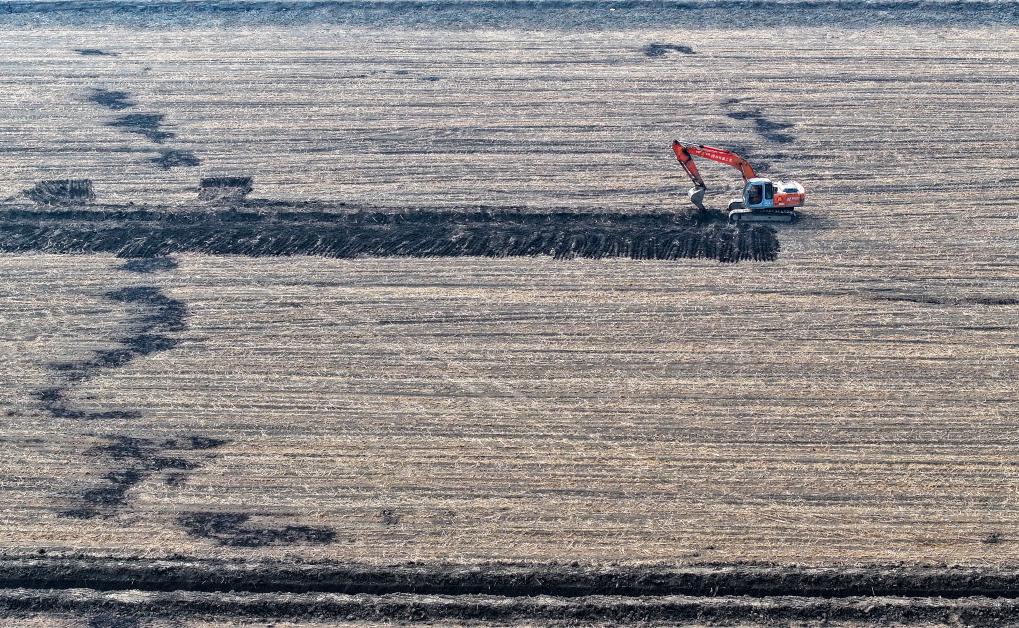 2025年3月11日,在天津市津南区八里台镇大韩庄村,工人驾驶挖掘机进行高标准农田施工作业(无人机照片)。新华社记者赵子硕 摄
