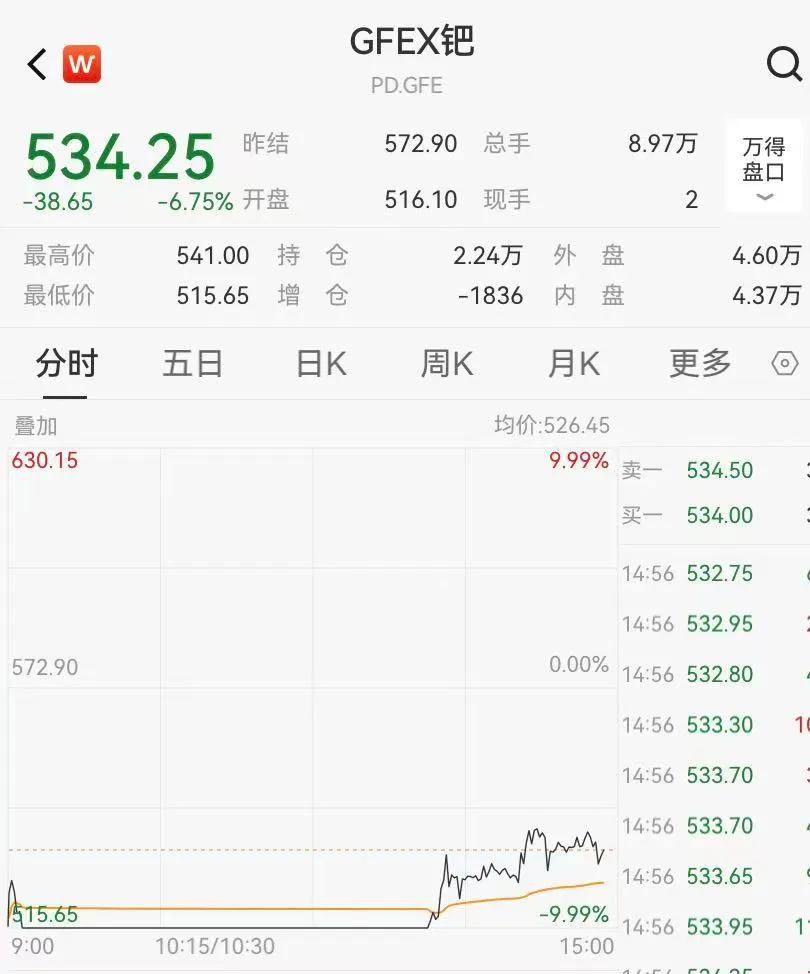 其次,广期所铂主力合约由跌转涨,截至15:00左右,涨幅扩大至5%;钯期货打开跌停板,跌幅收窄至不足7%。