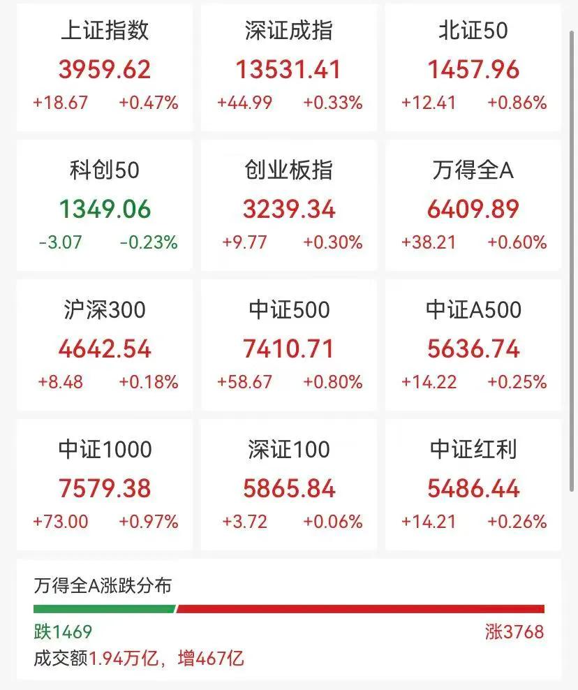 12月25日,A股午后集体走强,沪指录得7连阳,截至收盘,沪指涨0.47%,深成指涨0.33%,创业板指涨0.3%。沪深两市成交额1.94万亿元,较上一个交易日放量467亿元。全市场超3700只个股上涨,其中有93只个股涨停。