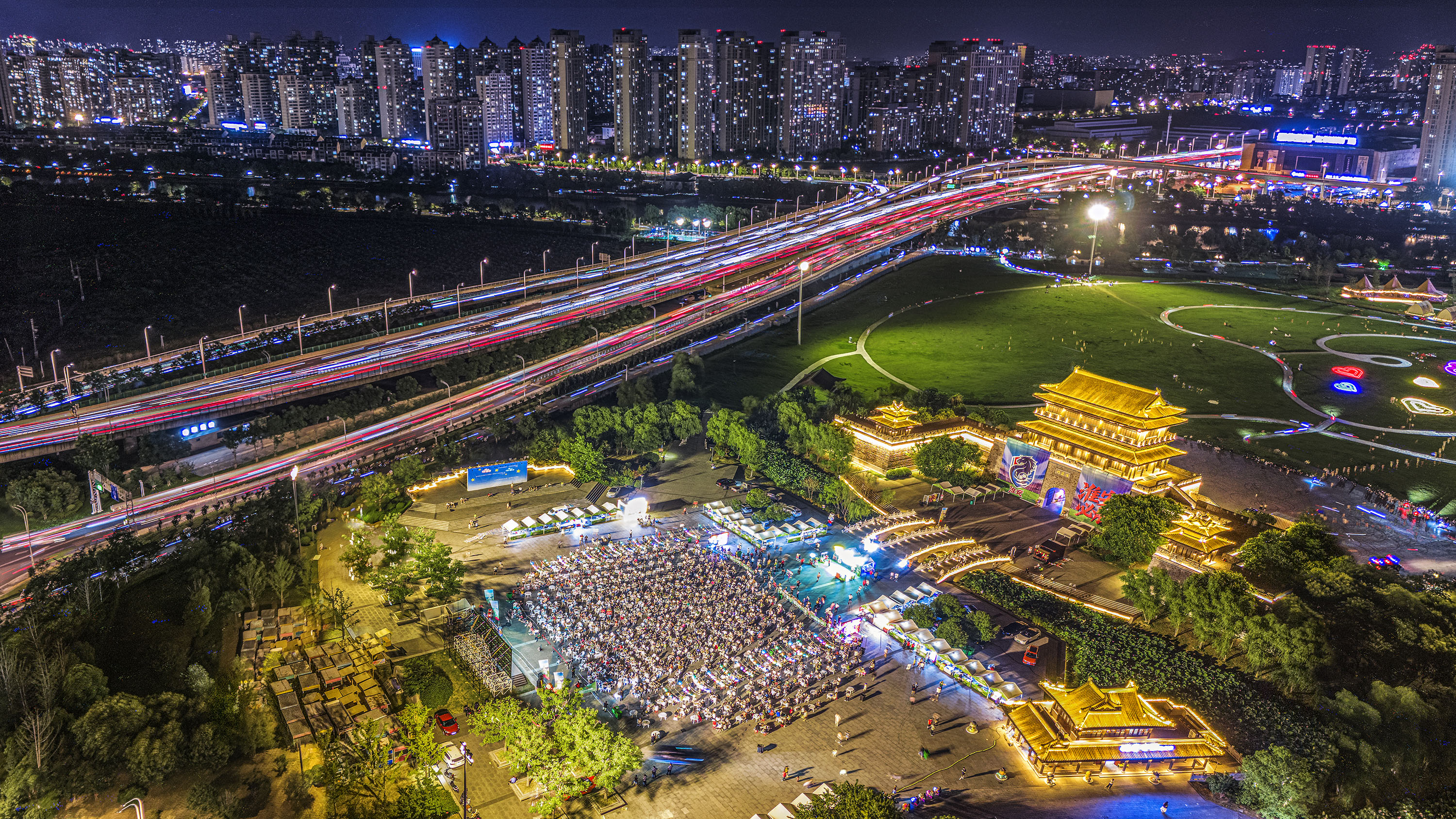 7月20日,球迷在淮安市漕运门广场观看“苏超”淮安队对阵无锡队的比赛(无人机照片)。新华社发(徐昌政 摄)