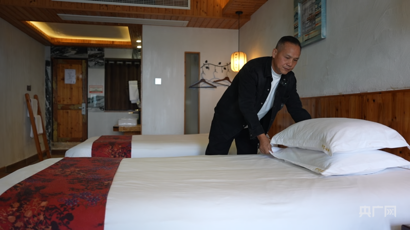 海利村村民杨彪正在打理自家民宿(央广网发 苏嘉垚 摄)