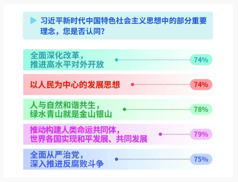 4)调查发现,习近平新时代中国特色社会主义思想获国际社会高度认同。本次调查选取了习近平新时代中国特色社会主义思想中的部分重要理念,询问国外受访民众的意见。结果显示,“构建人类命运共同体”“绿水青山就是金山银山”获近八成国际民意认同,“全面从严治党”“全面深化改革”“以人民为中心”获超过七成认同。发展中国家在上述五个方面的民意认同比例均超过八成,发达国家均超过六成。从地域差异看,发展中国家在上述五个方面的民意认同比例均超过八成,发达国家均超过六成。这种跨地域、跨发展阶段的广泛认同,印证了中国治国理政理念的普遍价值。