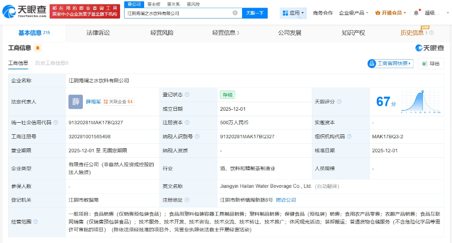 天眼查App显示,近日,江阴海澜之水饮料有限公司成立,法定代表人为薛海军,注册资本500万人民币,经营范围包括食品销售、食品用塑料包装容器工具制品销售、塑料制品销售、保健食品销售等。股东信息显示,该公司由海澜之家品牌管理有限公司全资持股。