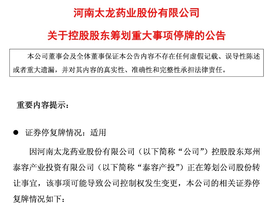 日前,太龙药业公告称,控股股东郑州泰容产业投资有限公司(简称“泰容产投”)正在筹划公司股份转让事宜,该事项可能导致公司控制权发生变更。因此,公司于12月2日开市起停牌,预计停牌时间不超过2个交易日。