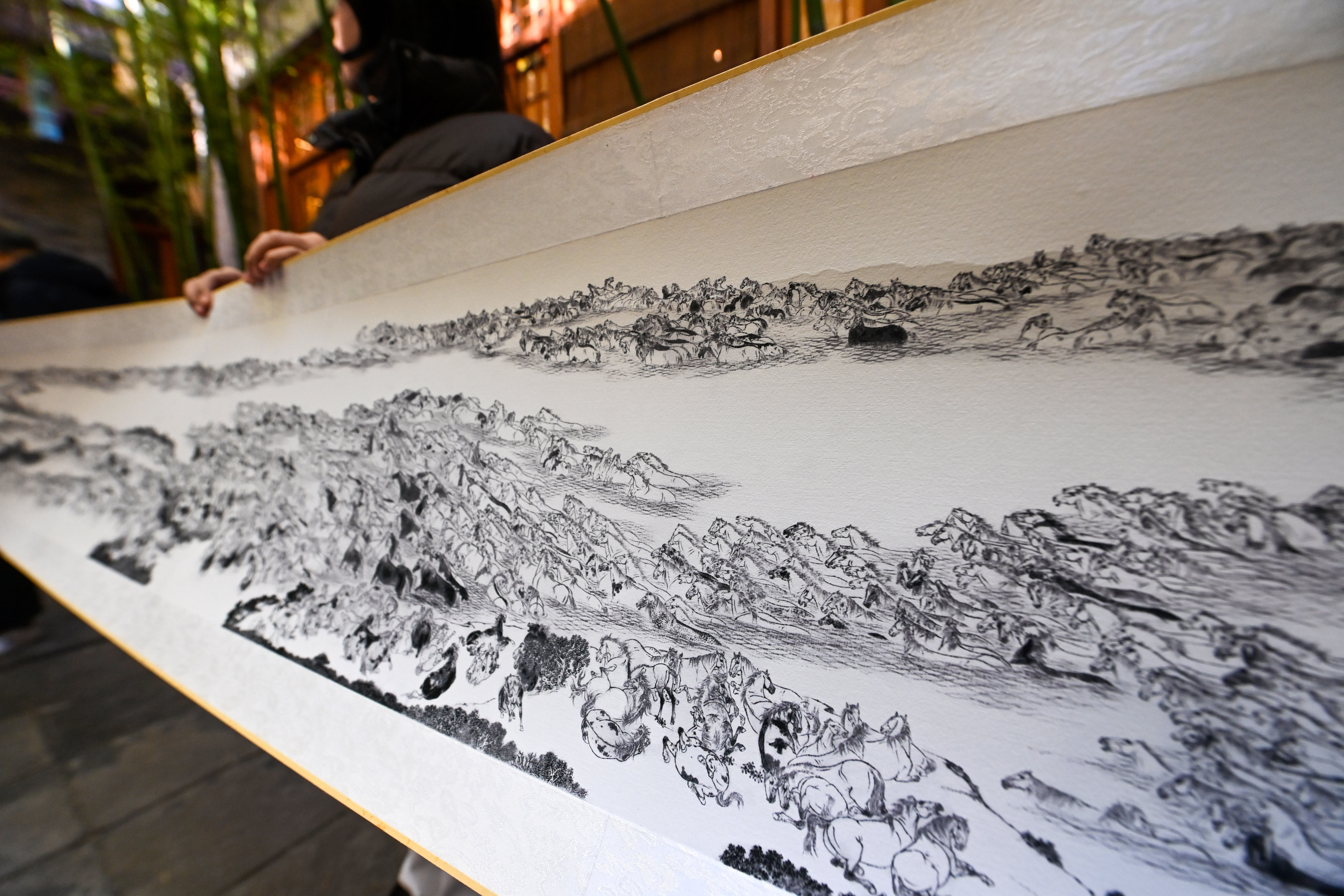 ↑ 这是12月29日在天津古文化街“喜迎马年,五代画马人马画艺术展”上拍摄的画家宫春虎的作品《万马图》(局部)。新华社记者 赵子硕 摄
