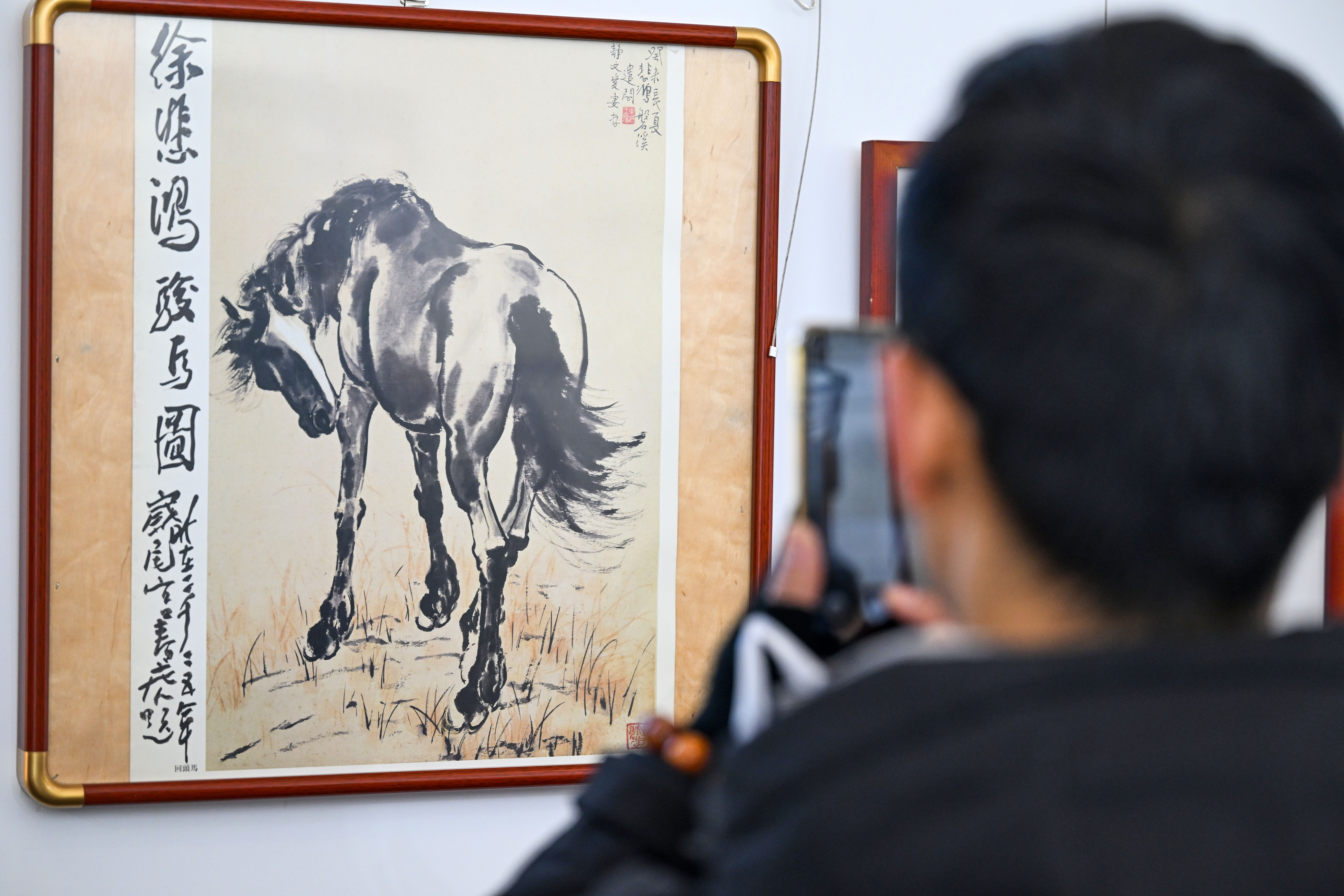 ↑ 这是12月29日在天津古文化街“喜迎马年,五代画马人马画艺术展”上拍摄的画作。新华社记者 赵子硕 摄
