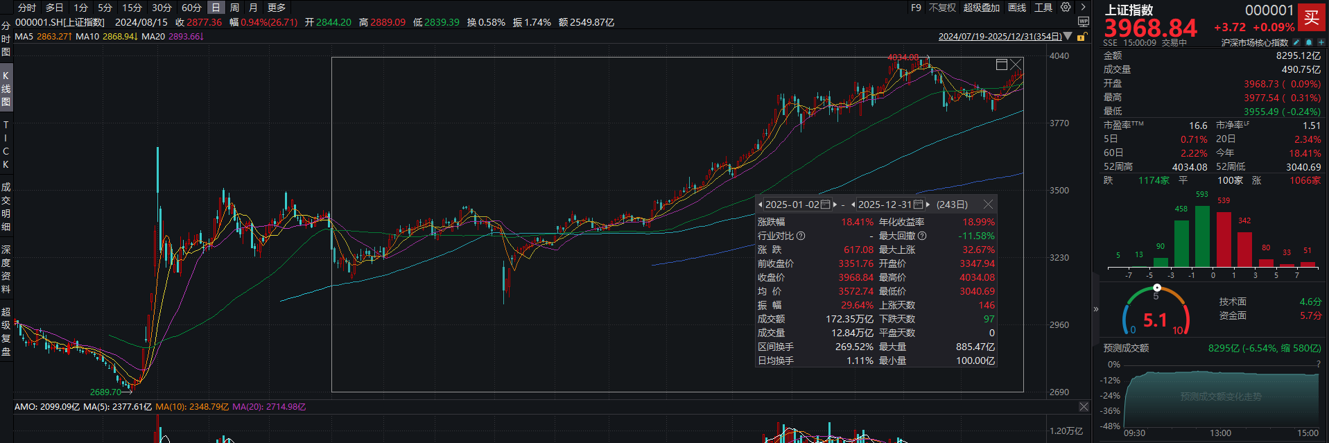 A股2025年收官:沪指11连阳全年收涨超18%,创业板指全年大涨49.57%