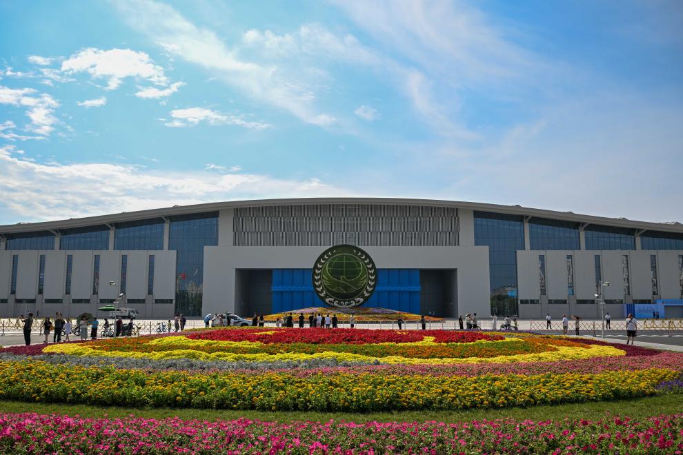 这是2025年9月1日拍摄的天津梅江会展中心外的花坛。新华社记者 孙凡越 摄