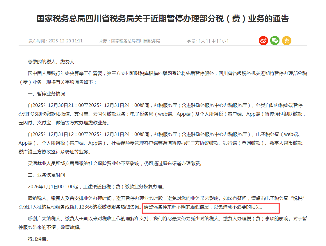 事实上,此次税费缴款业务暂停并非个例,而是全国范围内税务系统的常规年终结算安排。近期,贵州、海南等地税务机关均有发布类似通告,明确年终决算期间暂停部分税费缴纳业务。其中,国家税务总局四川省税务局在通告中还特别提醒纳税人,“请警惕各种来源不明的虚假信息,以免造成不必要的损失。”