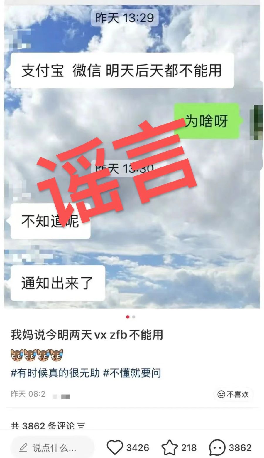 21财经《辟谣财知道》注意到,近日,在一些社交平台上,“12月30日、31日支付宝、微信支付不能使用”的消息流传,引发不少民众对日常支付的担忧。