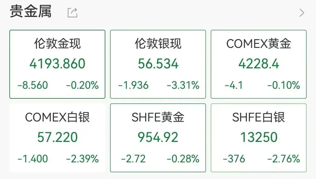 金银铜集体下挫。现货黄金短线走低约5美元,现报4193.86美元/盎司。现货白银跌超3%,报56.534美元/盎司。伦敦期铜高位回调,跌近1%至11377美元/吨。值得注意的是,在铜价创下历史新高后,高盛集团对铜价飙升发出警告,认为这一涨势难以持续,高盛预计2026年铜价将在1万至1.1万美元区间震荡。【详见】