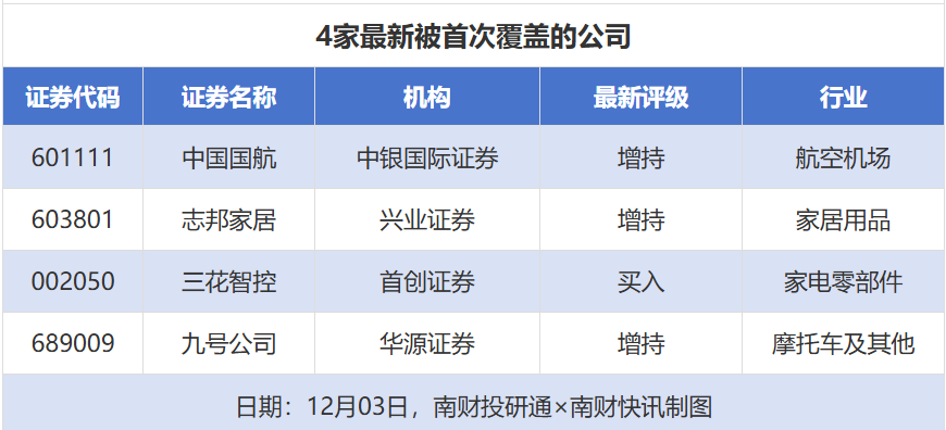 首次覆盖方面,12月3日券商共给出了4次首次覆盖,其中中国国航获得中银国际证券给予“增持”评级,志邦家居获得兴业证券给予“增持”评级,三花智控获得首创证券给予“买入”评级,九号公司获得华源证券给予“增持”评级。