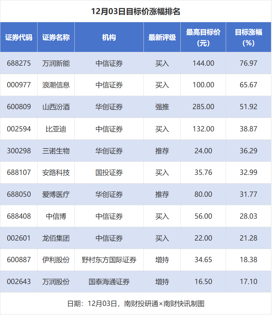 南财投研通数据显示,12月3日,券商给予上市公司目标价共11次,按最新收盘价计算,目标价涨幅排名居前的公司有万润新能、浪潮信息、山西汾酒,目标价涨幅分别为76.97%、65.67%、51.92%,分别属于电池、计算机设备、白酒行业。