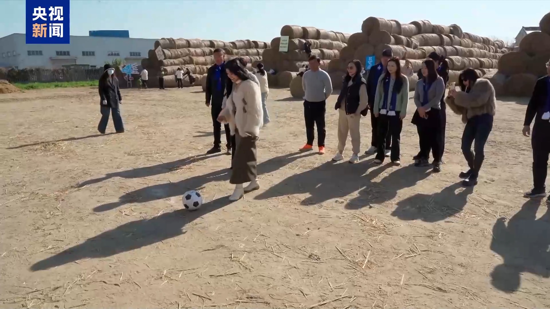 而在今年的“苏超”冠军城市泰州,“苏超”风刮进了周边的乡村。这个田野里的草垛,被改造成了一个“点球”场,来游玩、采风的球迷,在草垛田间展开趣味点球大战,稻草的香气与欢呼喝彩声交织,让欢乐充满了乡村田野。