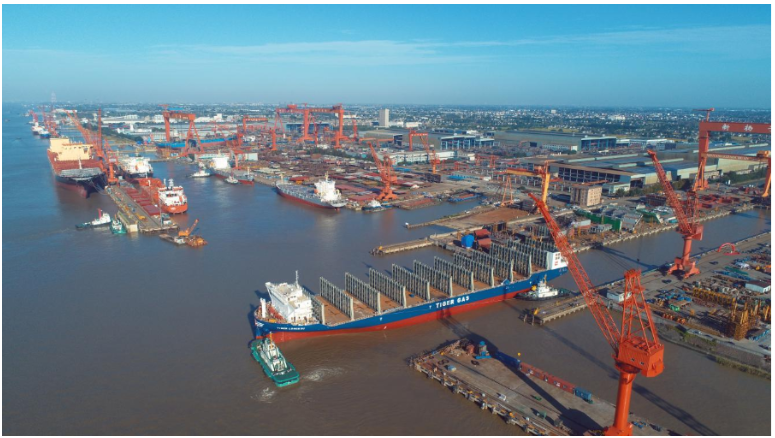 “襟江近海”的地理坐标,更让泰州成为长江经济带与长三角的关键节点。这里河道纵横、水网密布,水运业十分发达。这种“江海河联运”优势,不仅降低了原材料的运输成本,更便于成品船扬帆出海,为船舶出海打通了“最后一公里”。正是大江、大河、大港、大产业的优势,塑造了泰州造船业的独特基因。