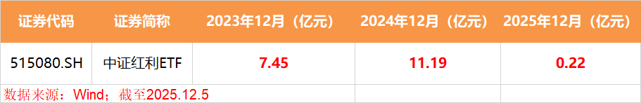 以中证红利ETF(515080)为例,Wind数据显示,2023年和2024年的12月,该ETF月度净流入额分别为7.45亿元、11.19亿元。今年12月第一周,中证红利ETF(515080)区间累计净流入额近0.22亿元;拉长周期看,近10日该ETF区间累计净流入额达2.71亿元。