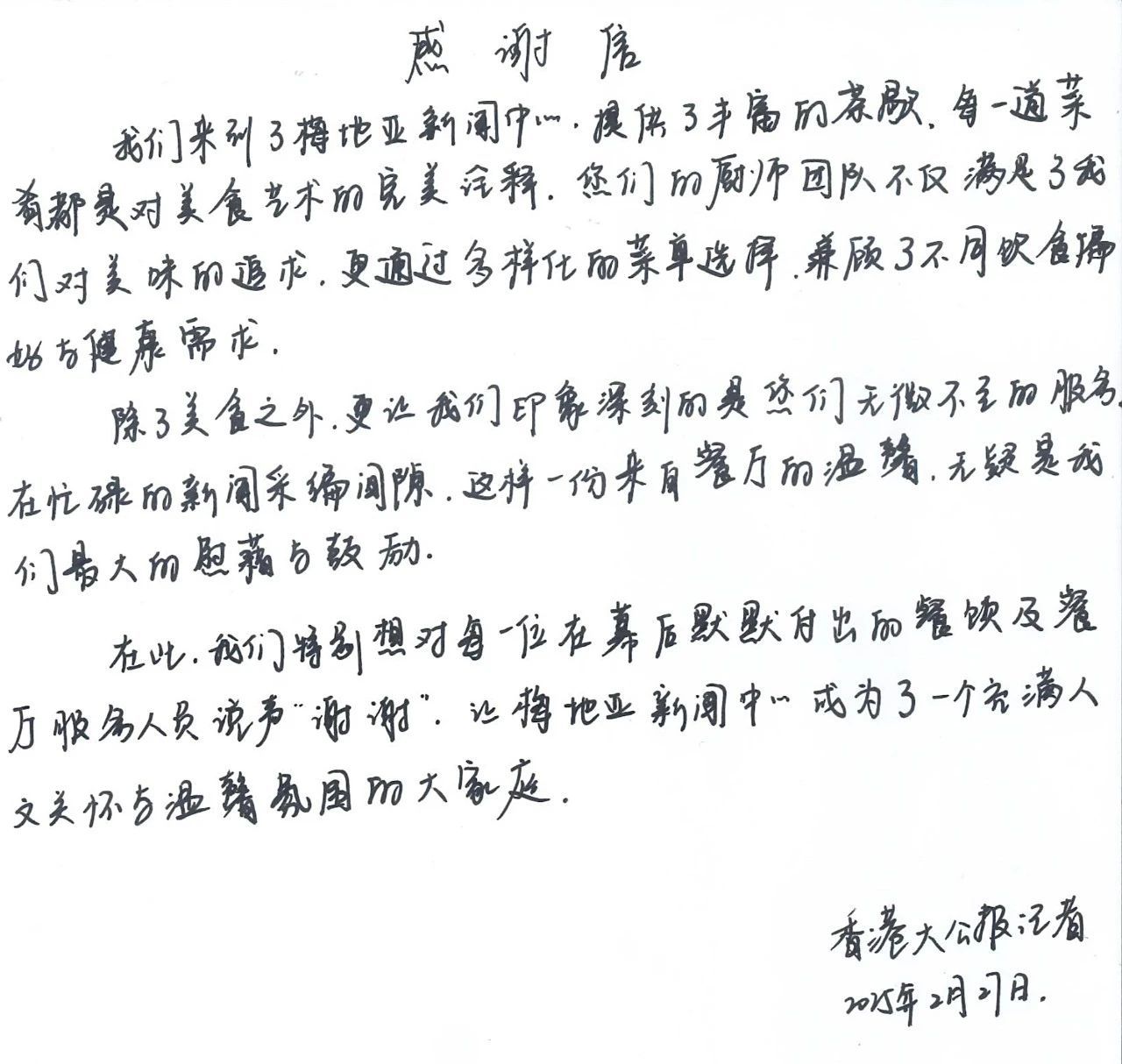 香港《大公报》记者还特意写来感谢信,为梅地亚中心的贴心服务点赞。
