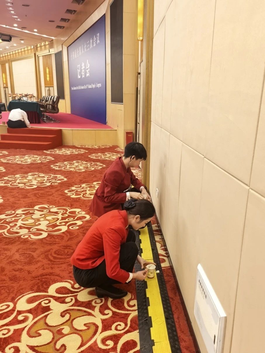 将白线拉直,每一把椅子的靠背都紧贴这根线,队列才能横平竖直。“人数少时,横向间隔6厘米,前后间隔40厘米;人数增加,便适当缩小间距。一切安排都以参会者的需求为核心,确保会议现场的舒适与高效。”仅需20分钟左右,就能完成整个会场的布置。高效打造秩序之美的背后,是无数次的实战演练和反复打磨。