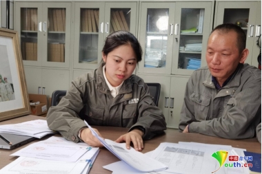 徐颖雪在500千伏金山变电站项目部讨论工程创优资料。国家电网供图