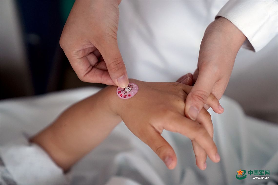护士把“勋章贴纸”贴在军娃小宇手上。中国军网记者孙悦摄