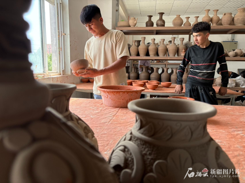 6月27日,阿克陶县巴仁乡就业实训基地内的米拉斯土陶手工艺专业合作社里,年轻匠人正在制作土陶。石榴云/新疆日报记者王晶晶摄