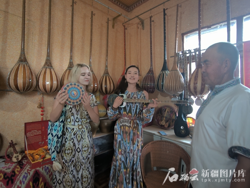 7月28日,在新和县依其艾日克镇加依村,俄罗斯籍网络达人梅丽莎(左)和网络名人古丽皮亚·买买提依明(中)正在体验民间手工乐器。石榴云/新疆日报记者甘兴华摄