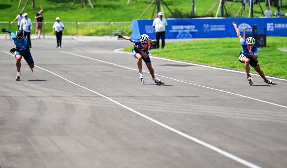 8月13日,2025年成都世运会速度轮滑公路赛(100米争先)女子决赛在成都舒悦公园举行。新华社记者谢剑飞摄