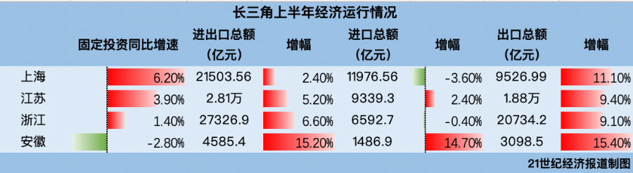值得一提的是,与出口高增相对,长三角多地上半年固定资产投资降幅较大。