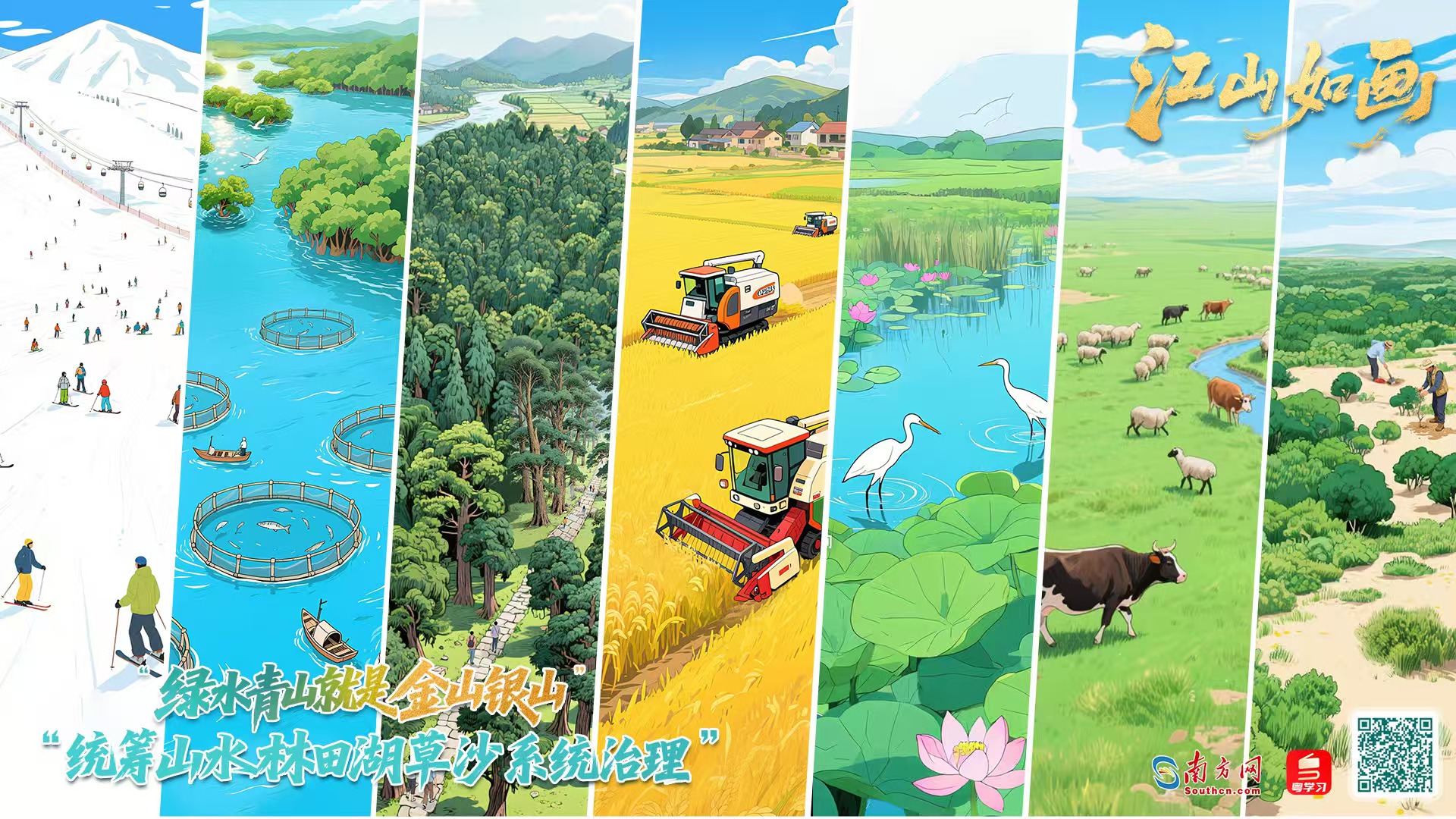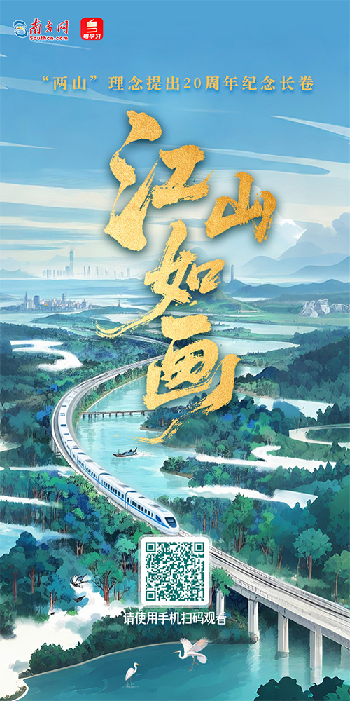 南方网、粤学习客户端策划制作“两山”理念提出20周年纪念长卷——《江山如画》,选取习近平总书记曾实地考察过的湛江红树林、白洋淀、青藏高原等80余个地点,沿海拔线一路攀升,描绘新时代“山水林田湖草沙一体化保护和系统治理”的生态文明建设新图景。同步嵌入“习近平生态文明思想文库”,立体呈现我国生态文明建设理论与实践不断深化、辩证统一的过程。