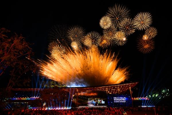 8月17日,第12届世界运动会闭幕式在成都举行。图为闭幕式现场焰火表演。新华社记者贝赫/摄