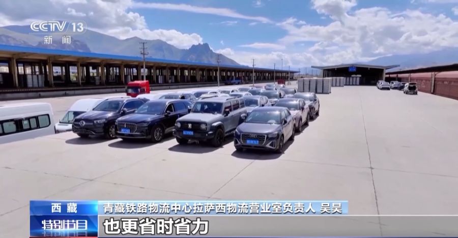 青藏铁路物流中心拉萨西物流营业室负责人吴昊:像这种车型就是我们铁路为了小汽车运输的专门车型,装小汽车能达到一百三四十辆。有的朋友喜欢把车辆拖到拉萨以后,开车去周边玩,也更省时省力。