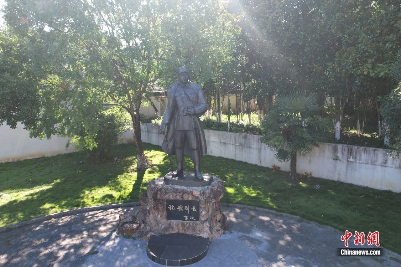 坐落在安徽泾县云岭镇新四军军部旧址前的叶挺雕像。(无人机照片)张强摄