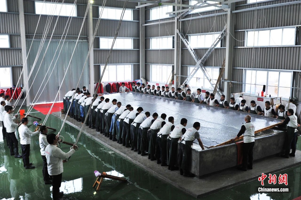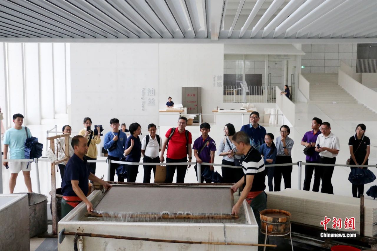 马来西亚游客在中国宣纸小镇参观宣纸捞纸技艺。张强摄