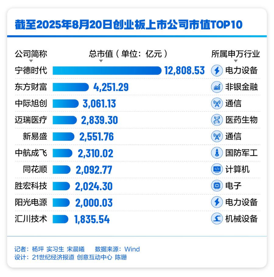 截至2025年8月20日,创业板前五大市值行业分别是电子、电力设备、医药生物、计算机、机械设备,总市值分别为4.67万亿元、3.97万亿元、3.41万亿元、3.20万亿元和2.78万亿元。