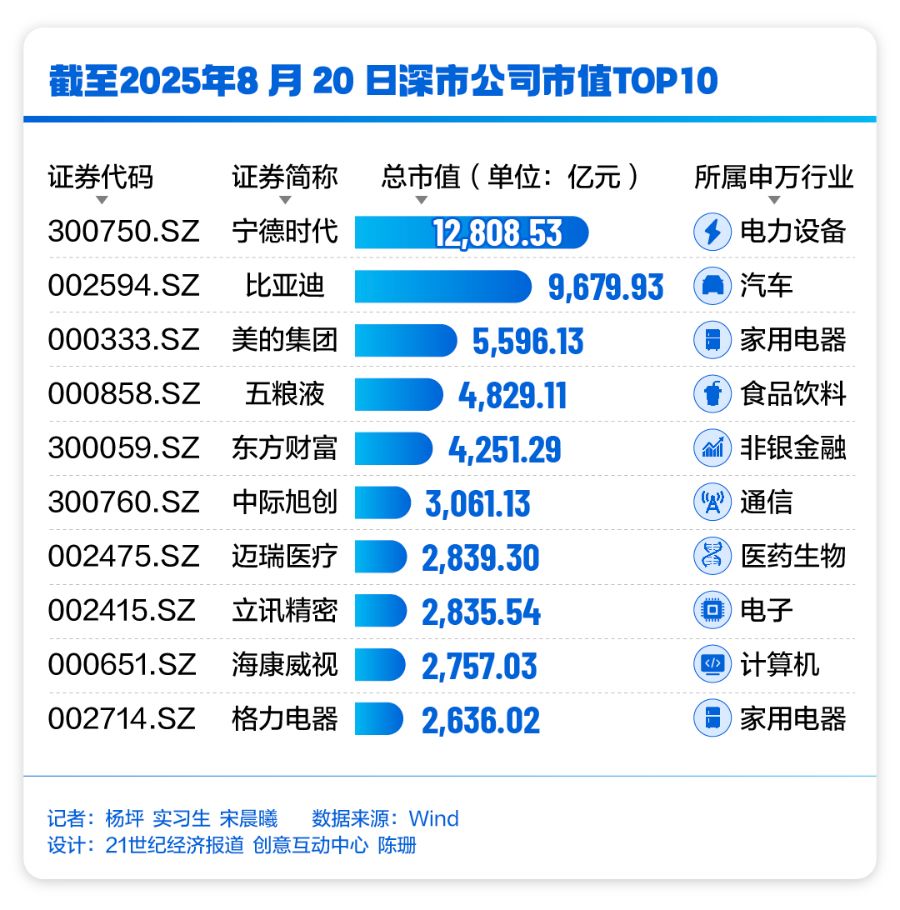 数据显示,截至目前(8月20日,下同),深交所是市值最高的五大行业分别为电子、电力设备、医药生物、机器人、机械设备,总市值分别为4.67万亿元、 3.97万亿元、3.41万亿元、3.20万亿元和2.76万亿元,均为科技创新产业。