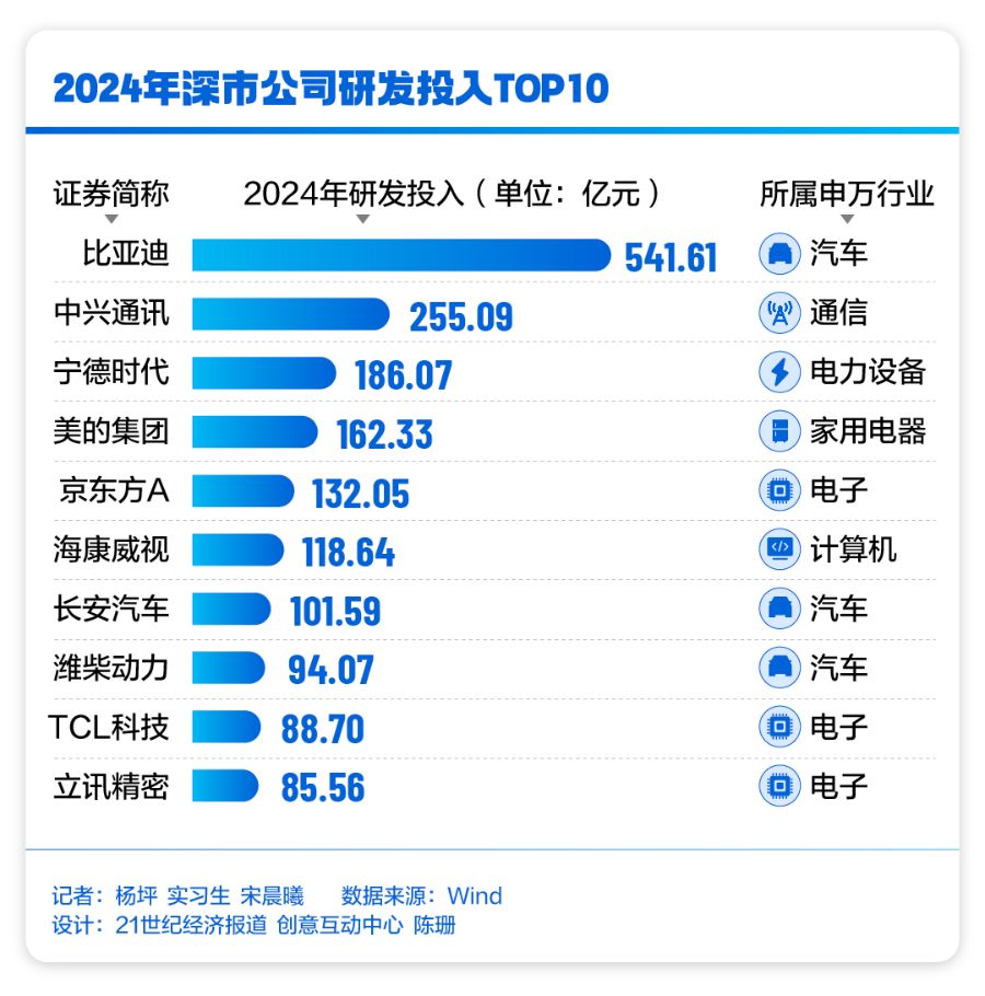2024年,深市研发合计超过7600亿元,较2020年增长近3000亿元,增幅超68%,超过10亿元的公司数量达到119家,较2023年增长6家,其中比亚迪、中兴通讯、宁德时代等7家公司累计投入均超100亿元。